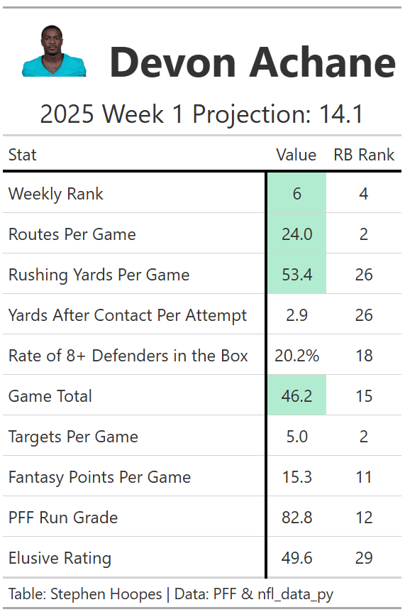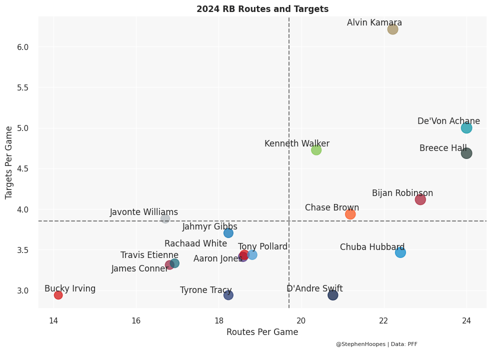 But that’s fantastic news for a pass-catching RB like Achane. In my Most Predictable Running Back Stats article, I found that receiving work was still not fully captured by the market, with both routes and targets per game being crucial elements to predict future week fantasy points. Well, Achane ran the most routes per game in the league last year and was second in targets per game behind Alvin Kamara.