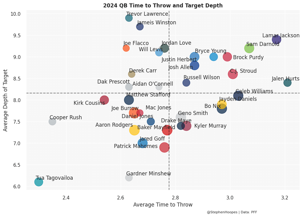 Partially as a trauma response to the offensive line play, Tua Tagovailoa had easily the fastest time to throw among QBs last season. The x-axis of the graph below shows how many seconds a QB’s typical pass came after the snap. And it also shows that QB’s average target depth on the y-axis. There’s Tagovailoa all on his own in the bottom-left corner. An insanely quick release time, along with a very shallow target depth.