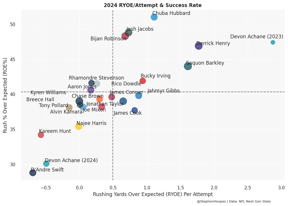 De'Von Achane narrowly missed going from first in rushing efficiency to worst over the past two seasons. The graph below shows rushing yards over expected (RYOE) on the x-axis and Next Gen Stats’ version of success rate on the y-axis. You’ll find the 2023 version of Achane in the top-right corner, outpacing both Derrick Henry and Saquon Barkley from last season. And then you’ll find the 2024 version of Achane in the bottom-left corner near the D'Andre Swift Disaster Zone. So, what the heck happened?