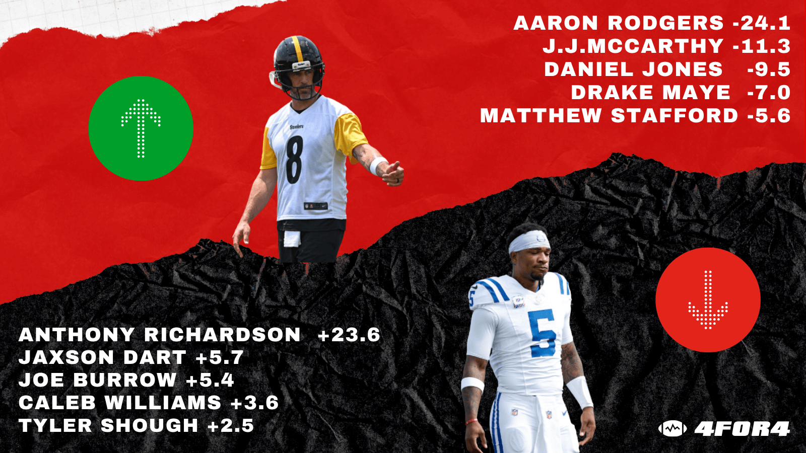 The painful saga of whether and where Aaron Rodgers will play in 2025 came to an end since I last wrote this column, and most of us couldn't be happier. His one-year deal with the Steelers caused a full two-round spike in ADP, but he's still in fantasy QB3 territory as the QB28 in Underdog drafts. Rodgers is also the QB28 in 4for4's ranks.