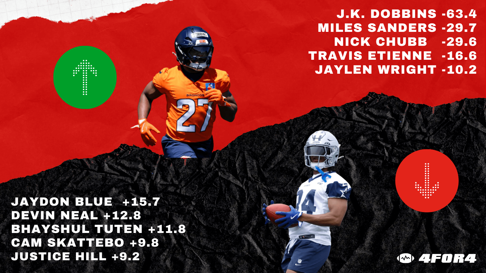 Drafters appeared to be flip-flopping on the Dallas RB room over the last month, as Jaydon Blue dropped a round and a half, while Miles Sanders is now being selected 30 spots earlier in best ball formats. The Cowboys backfield also features former Bronco Javonte Williams to murk it up even further. Blue was taking reps as a kick returner back in OTAs, which may have something to do with this slide, but until we know more, consider the rookie a low-end RB3 as he'll likely be eased into the mix.