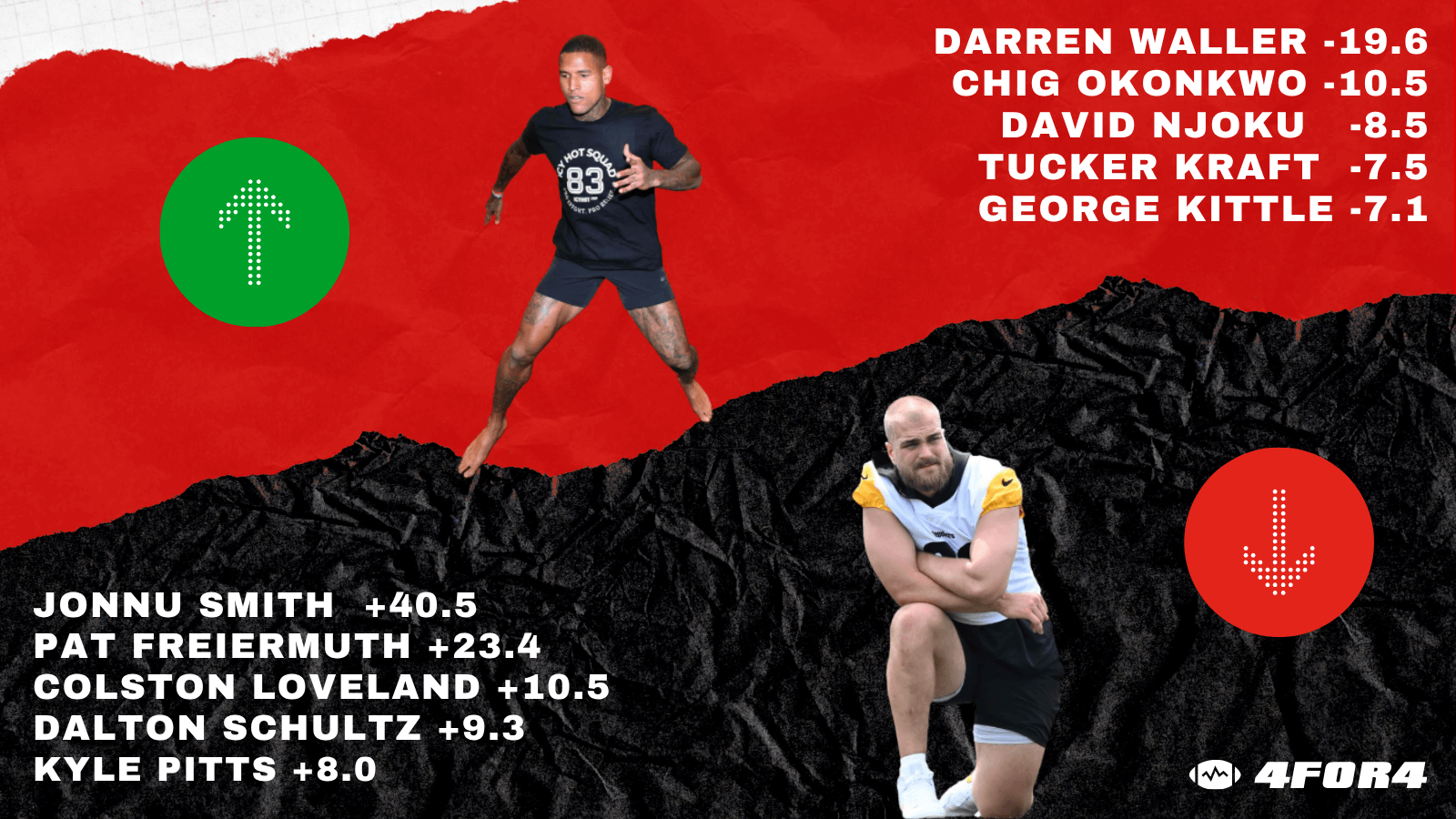 Jonnu Smith, Steelers (ADP: 143.8, +40.5) and Pat Freiermuth, Steelers (ADP: 194.3, +23.4)