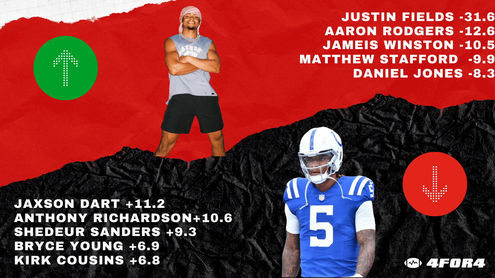 It's been sad to watch the fall of Anthony Richardson but we're now looking at an open competition for the Colts' starting gig between the former first-round dual-threat QB and Daniel Jones. Yes, that Daniel Jones. Richardson slid down to spot 14.03 over the last few weeks but could be a steal if he can clean up his throwing motion thanks to sessions with Chris Hess, the same biometrics coach who worked with Josh Allen.