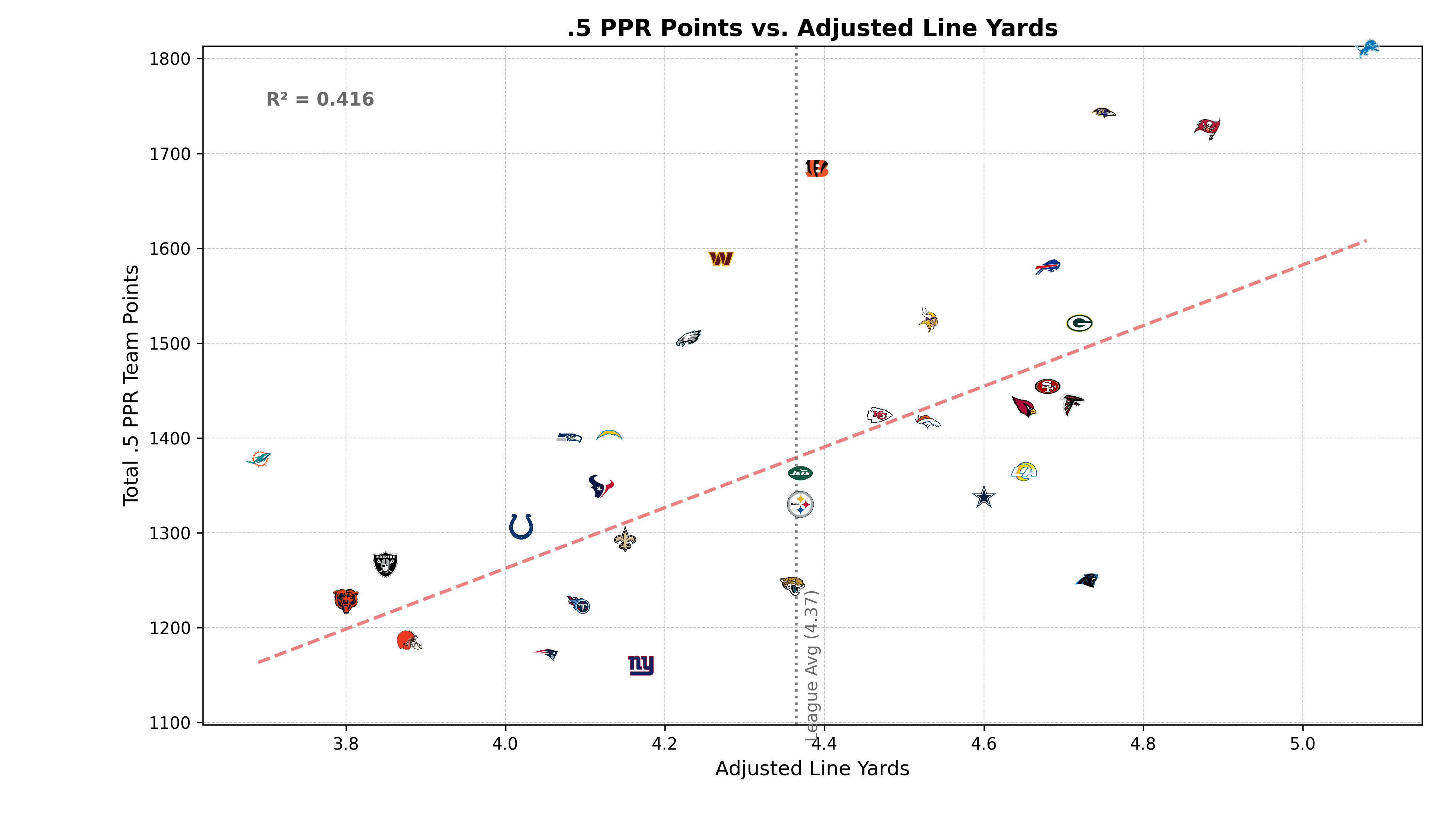 Adjusted Line Yards does a pretty good job on its own in regards to predicting fantasy scoring for an NFL team. It makes sense, as the league's best rushing attacks continue to fuel offenses as defenses got lighter to stop the pass over the last decade or so.
