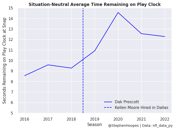 The one thing we know for sure with a Kellen Moore-led offense is that it will be fast. I did a study last season that looked into whether a new play caller or a veteran quarterback determines pace. And I found that in the majority of cases, it’s the veteran quarterback who dictates the pace of the offense. But there are exceptions. Kellen Moore is one of those exceptions. The graph below shows the pace at which Dak Prescott played before and after Kellen Moore’s hiring in Dallas. The offense sped up instantly by two-to-six seconds each season.