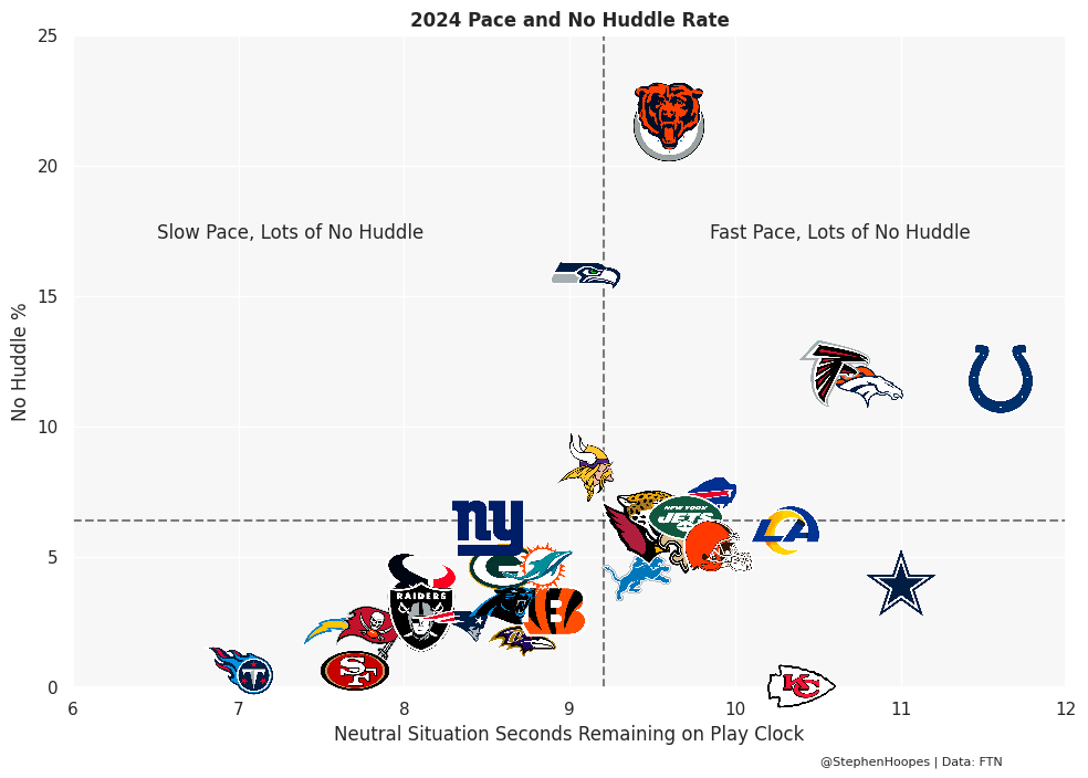 Next up is pace. The graph below shows team pace on the x-axis and their no-huddle rate on the y-axis. The pace metric is the average number of seconds remaining on the play clock at the snap. And we’re only looking at neutral situations. That means plays in the first three-quarters of the game where the score is within eight points, excluding the last two minutes of the half. For the eagle-eyed readers, both the Eagles and Commanders are excluded from the graph to make it easier to see the other teams. But both would be in the top-right quadrant.