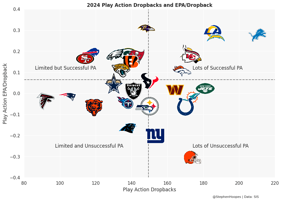 And the final topic before digging into team-level expectations is expected points added (EPA) on play-action passes. EPA measures how much each play impacts a team’s potential to score. If the team’s likelihood to score increases after a play, then EPA increases, and the opposite is true if the team’s scoring potential decreases. The y-axis of the graph below shows EPA by dropback only on play-action attempts. The x-axis is just the raw number of play-action dropbacks last year.