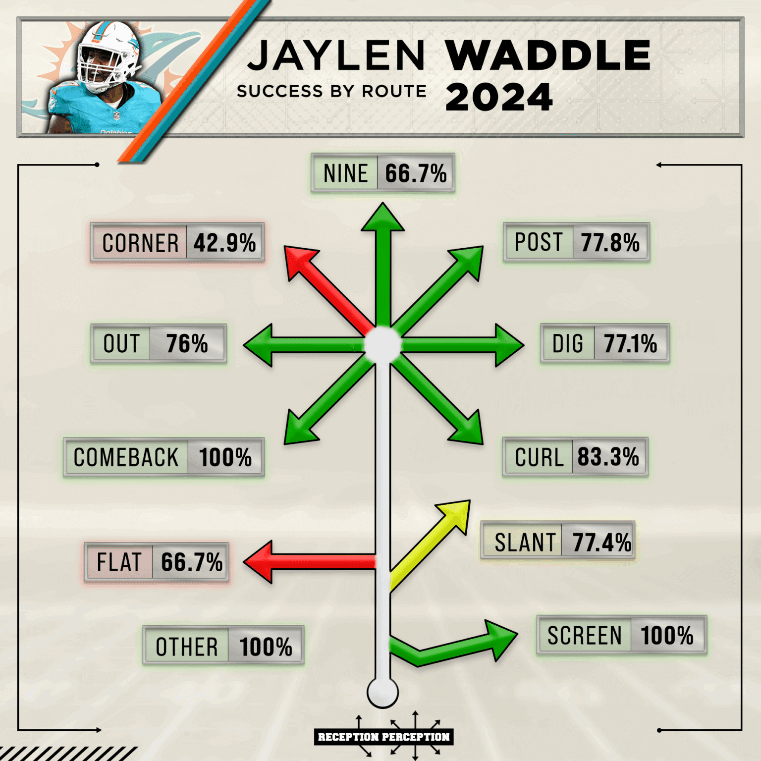 “This is the area where I thought Waddle didn’t win with as much burst and precision against zone, as his success rates on those two patterns dipped below 80% for the first time since his rookie season. The numbers were fine but a bit lower than expected. He does have to own some of the blame for last year’s dip.”