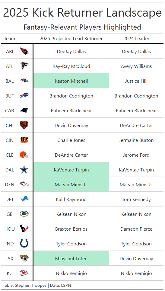 These situations are very much in flux this early in the preseason. But below are the projected returners by team from ESPN, along with who led each team in kickoff return yards last season. And I’ve highlighted in green the players that are fantasy-relevant, with a pretty broad definition of relevance.