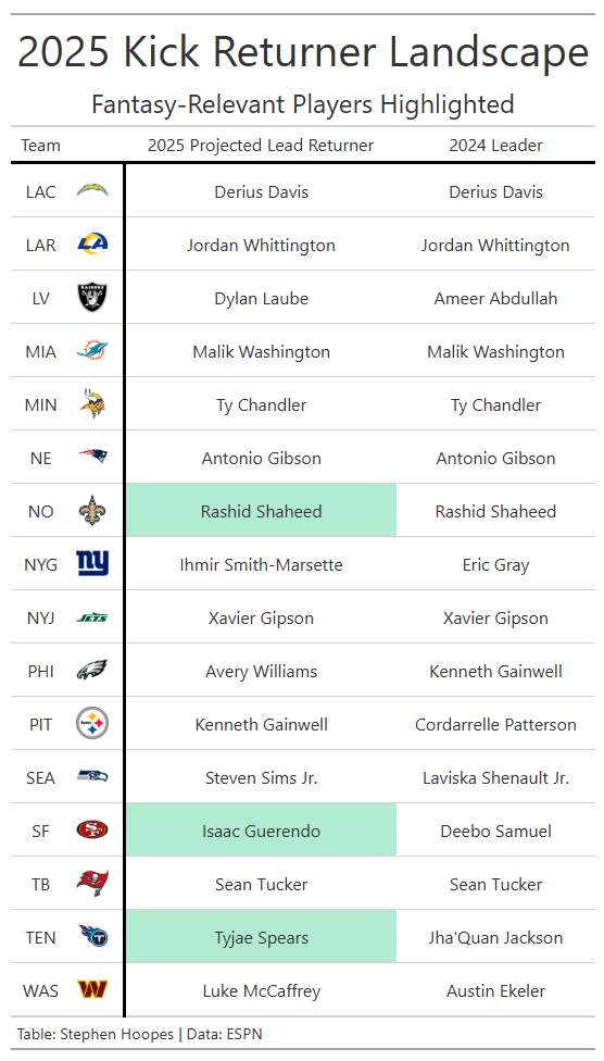As an example, I was in a league last year where you earned one fantasy point for every five return yards. So, a 30-yard kick return was the equivalent of a touchdown. Rashid Shaheed was an absolute menace in that league…until he tore his meniscus in Week 6. But all of this is to say, if you have questions about your specific scoring settings, feel free to reach out to me on Bluesky. With that context in mind, let’s first dig into what happened last year before looking at whom to target in return leagues in 2025.