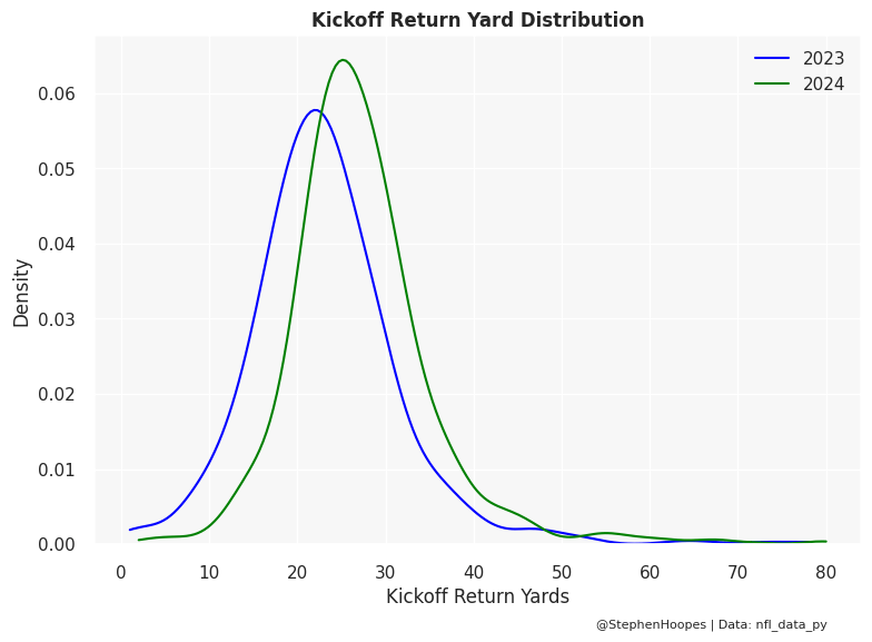 Which leads us to this coming season. The big change is that the NFL is increasing the cost of a touchback further, with the ball now starting at the 35-yard line. By widening the gap between a touchback (35-yard line) compared to the average return last season (about 28 yards), the hope is that we start seeing return rates like the NFL estimated prior to 2024. The NFL also approved a smaller change to how blockers on the return team are allowed to line up that might lead to longer returns.