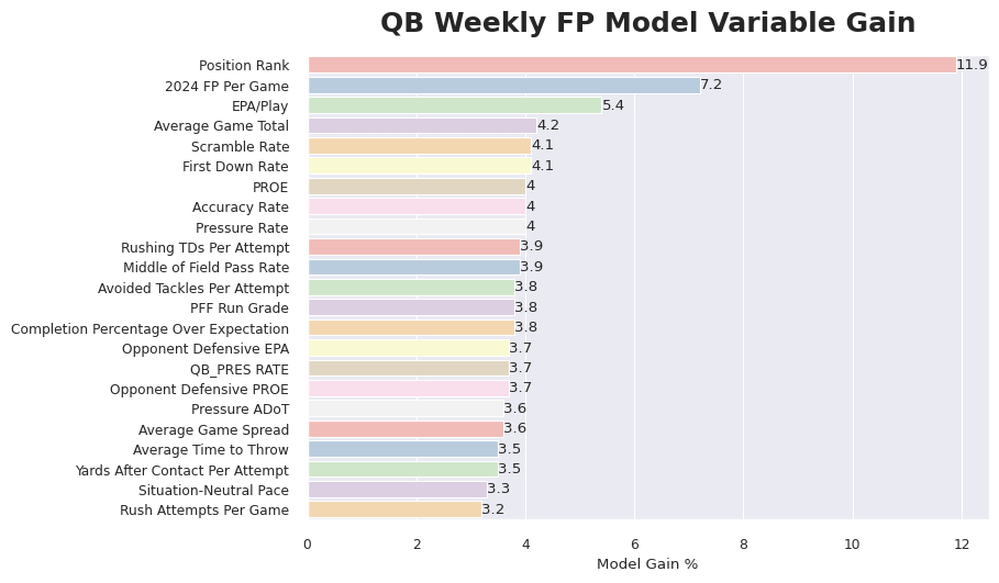 The first is to look at how much each variable contributes to the model, also called its gain. That’s what the graph below does. It lists each variable in the model and what percentage it contributes to the model. Position rank is John Paulsen’s weekly rank going back to 2021. And it’s going to be a common theme in this series that his position rank is the most important variable. I cannot recommend his rankings enough.