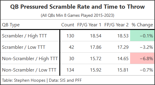 As a quick aside, we know QB rushing provides both a floor and ceiling as the scrambler / high TTT bucket shows in the table below. But it’s also interesting to see the non-scrambler / high TTT archetype as the one you want to avoid in fantasy. They’re not getting the ball out quickly and lack rushing as an answer to pressure. Aaron Rodgers and Daniel Jones are the most notable names in this bucket from 2024.