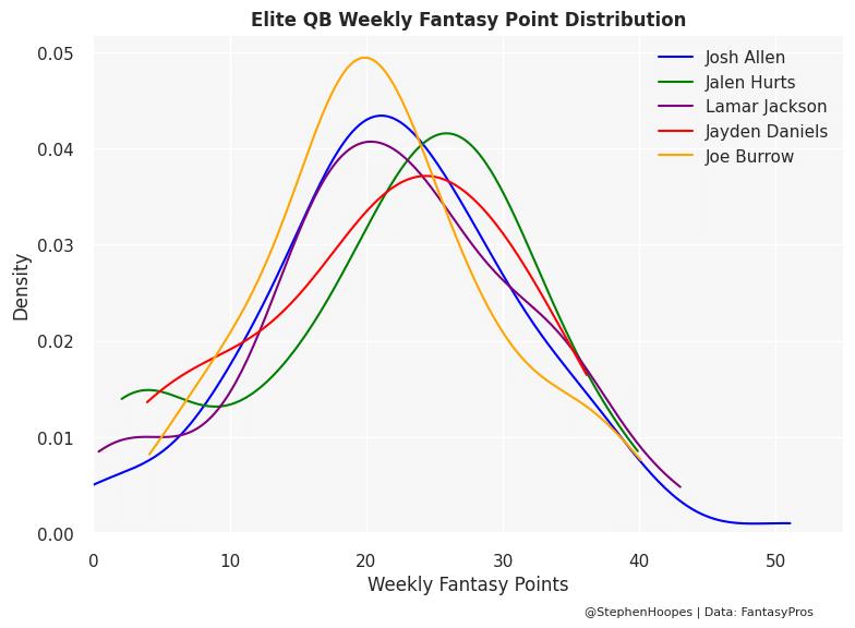 The graph below plots historic weekly fantasy points by QB. And Joe Burrow is the orange line. What you’ll notice is weekly scores from 10 to 23 points represent a larger share of Burrow’s outcomes compared to the other players. And he has the smallest portion of his outcomes in the 27+ point range. Burrow absolutely can spike in a given week. It’s just historically been less frequent than the alien mobile QBs drafted before him.