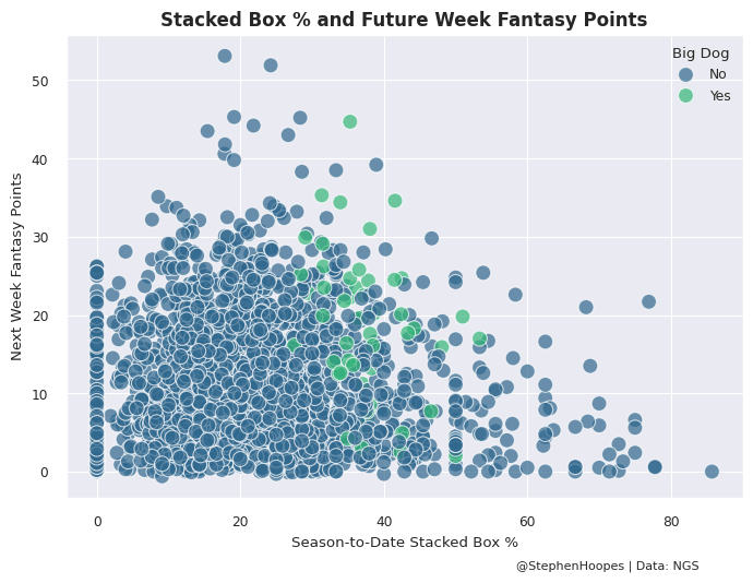 The graph below shows the relationship between an RB’s season-to-date stacked box rate and their fantasy points the next week. In general, you want your RB to avoid the extremes. You don’t start getting the true spike weeks until an RB has a stacked box rate of at least 10%. And the spike weeks are starting to trail off in a big way around the 40% mark. That all makes sense. You want your RB to be good enough that the opposing defense sees them as a threat. But you don’t want your RB to be in an environment where the defense feels they can stack the box without consequences from the pass game.