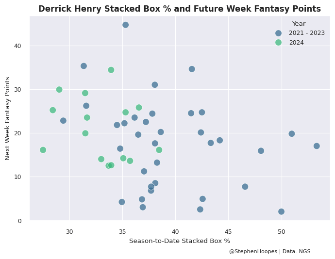 - Trends with stacked box rate are counterintuitive and largely caused by Derrick Henry’s insanity.