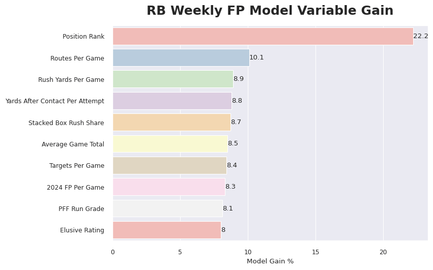 I expanded on this more in the QB article, but I’m taking a different approach this year. Instead of looking at each variable in a vacuum, I’m evaluating all variables at once. And one of those variables is market ADP. Additionally, I’m using weekly rather than seasonal data. To dig into the RB model specifically, let’s start by seeing how much each variable contributes to the model (aka its gain). That’s what the graph below does. It lists each variable in the model and what percentage it contributes to the model.