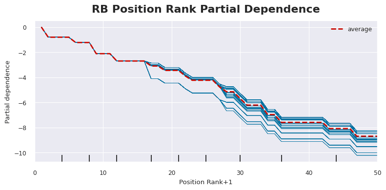 To look at how each individual variable works, we can use a partial dependence plot. These plots isolate the variable we’re looking at (in this case, position rank) and show how future fantasy points change as you move the position rank of the QB. Position rank is John Paulsen’s weekly rank going back to 2021.