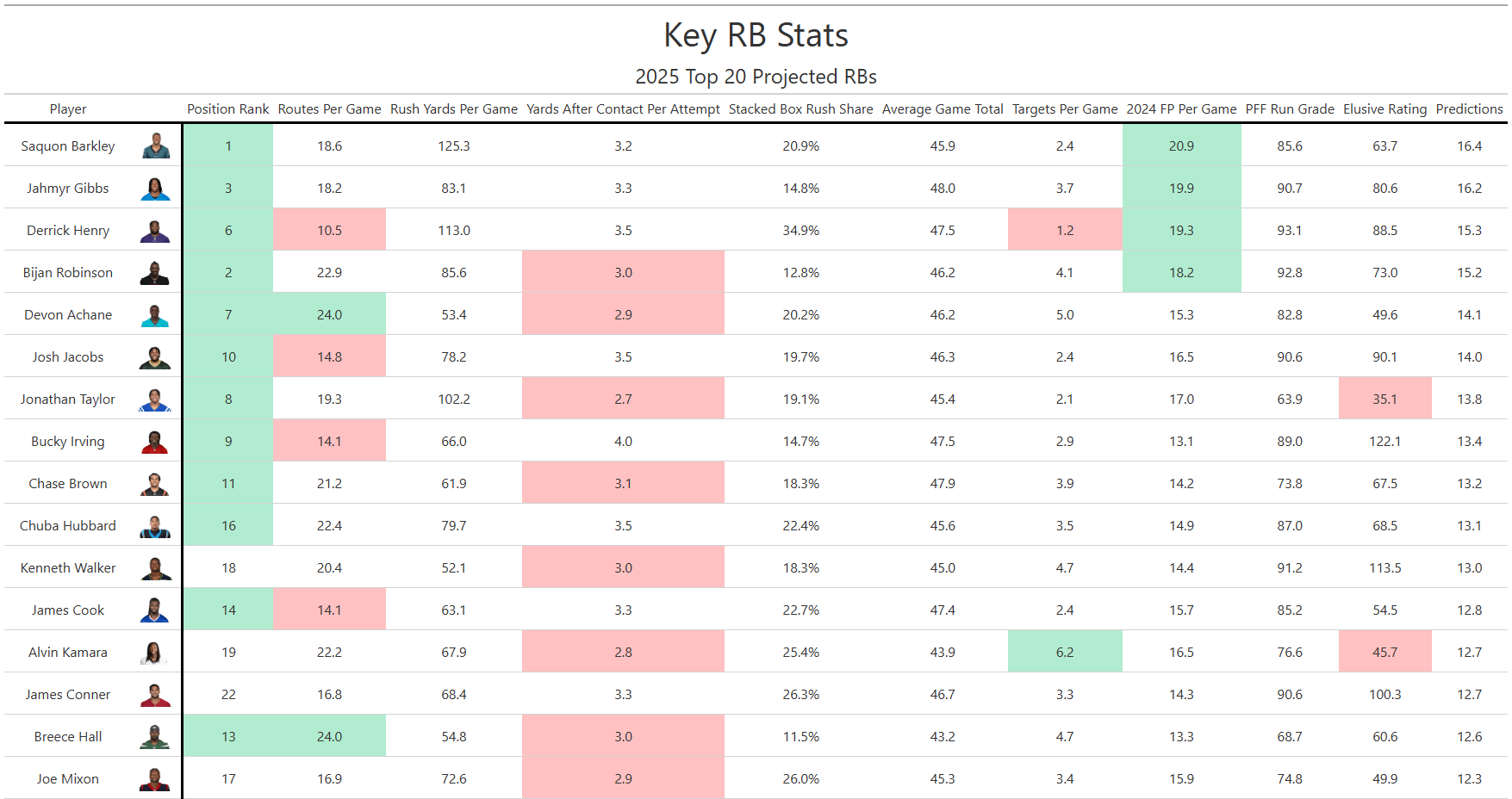 So, what does the 2025 veteran RB landscape look like? The table below sorts them by their projected fantasy points per game using the above methodology. And I’ve highlighted in green the stats where an RB exceeded a key benchmark and in red when they failed to hit a key value. The number of routes that an RB runs per game is the most important piece of context on top of their position rank. And we also see targets per game as an important variable in the model as well. That means the market is not fully baking in the importance of receiving for RBs even in half-PPR formats.