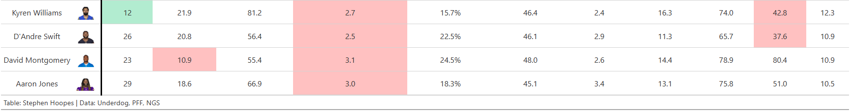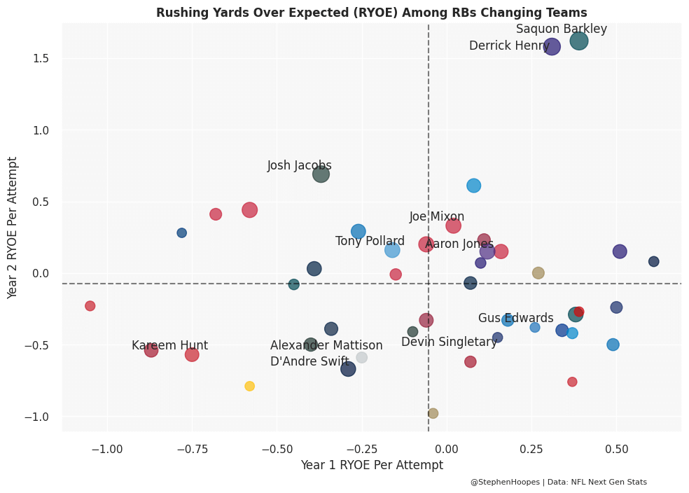 With the exception of Barkley and Derrick Henry as huge outliers, there’s no trend here. You’re better off looking at how well the RB’s new team did the prior year in RYOE. So, RYOE isn’t doing a great job of baking in team context, particularly run blocking. Because of that, we should be more willing to invest in free agent RBs with poor RYOE that land on teams with good RYOE. Unfortunately, there aren’t any obvious candidates for that this year, especially since I don’t believe Javonte Williams’ poor RYOE was the fault of the Broncos’ offensive line. But the general point is offensive line play and scheme are very important to RB production.