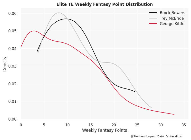 The graph below shows the distribution of weekly fantasy points for Bowers, McBride, and Kittle. Bowers and McBride have a larger share of “usable” weekly performances compared to Kittle. But Kittle still has excellent week-winning ceiling outcomes. Definitely small samples here for McBride and especially Bowers, but this is why I view Kittle as a better pick than T.J. Hockenson (for example). We’re trying to find these guys with league-winning upside rather than solely focusing on weekly median projections.