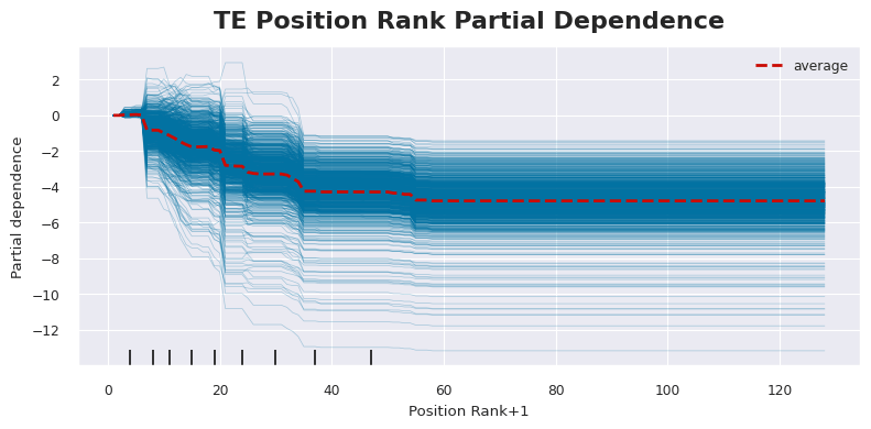 To look at how each individual variable works, we can use a partial dependence plot. These plots isolate the variable we’re looking at (in this case, position rank) and show how future fantasy points change as you move the position rank of the TE. Position rank is John Paulsen’s weekly rank going back to 2021.