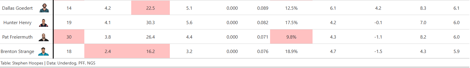 I think the distribution is pretty intuitive. As your tight window target rate increases above 20% or 30%, your future week fantasy point ceiling decreases. If a lot of your targets are coming with limited separation, you’re probably just not very good at creating separation. That is going to limit your target ceiling and your production on the targets you do get. But you also don’t want a very low, tight window target rate like 5%. We want the QB to look our TEs’ way even when they’re not fully open. It’s similar to slot rate for WRs, where we’re just trying to avoid the extremes. The biggest names here are Travis Kelce’s 8.2% tight window rate on the low end and Kyle Pitts’ 27.0% tight window rate on the high end.