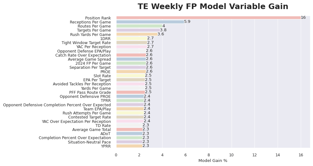 I expanded on this more in the QB article, but I’m taking a different approach this year. Instead of looking at each variable in a vacuum, I’m evaluating all variables at once. And one of those variables is market ADP. Additionally, I’m using weekly rather than seasonal data. To dig into the TE model specifically, let’s start by seeing how much each variable contributes to the model (aka its gain). That’s what the graph below does. It lists each variable in the model and the percentage it contributes to the model.
