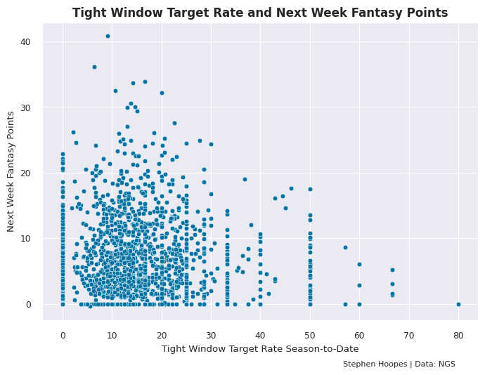 One interesting variable that popped up is the tight window target rate from Next Gen Stats. It counts a tight window target as one where the separation between the receiver and the nearest defender is less than one yard at pass arrival. The graph below shows a TE’s average tight window target rate at a particular point in the season and how many fantasy points they scored in their next game.