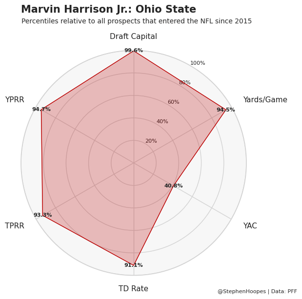 Harrison was the near-consensus WR1 in what was an incredibly strong 2024 rookie WR class. The graph below shows Harrison’s stats relative to all WR prospects that entered the NFL from 2015-2024. He was 90th+ percentile in draft capital, receiving yards per game, yards per route run (YPRR), targets per route run (TPRR), and touchdown rate. It’s rare that a WR is a top-four pick in the NFL draft, and a testament to how clean of a profile Harrison had coming into the league.