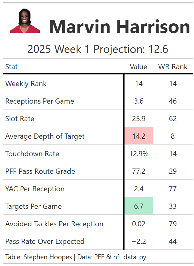 The table below shows some key stats for Harrison from last season. I’m using just Underdog ADP for the modeling process here, with his 27th-overall rank doing some Jalen Hurts squat-esque lifting for his projection. On sites like Underdog, where the ADP gap between Harrison and his teammate, Trey McBride, is nonexistent, I have an incredibly tough time not just taking McBride. I think McBride simply outscores Harrison again in fantasy points, and you get the added benefit of the TE designation.