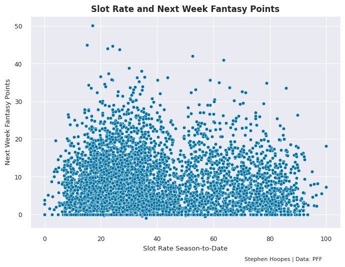 Continuing down this line of thinking, the graph below shows a WR’s share of routes from the slot at a particular point in the season on the x-axis. And the y-axis shows their fantasy points in their next game. You can kind of draw an arch or a half-circle over the data. The values tend to be smaller on both the left and right sides of the graph. And that makes sense. We want our WRs in fantasy to get lay-up targets over the middle of the field, but also to have the ability to win on the outside.