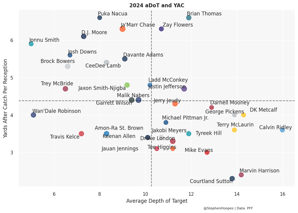 The graph below shows the relationship between target depth and YAC. You’ll find Harrison all the way in the bottom-right corner. It gets increasingly difficult to earn yards after the catch on deeper routes. And Harrison had one of the highest target depths in the league due to his deployment by the Cardinals.
