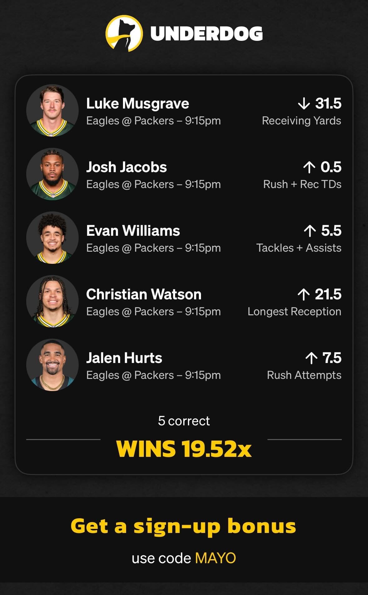 TAIL OR FADE + code “MAYO” at underdog for a deposit bonus up to $100