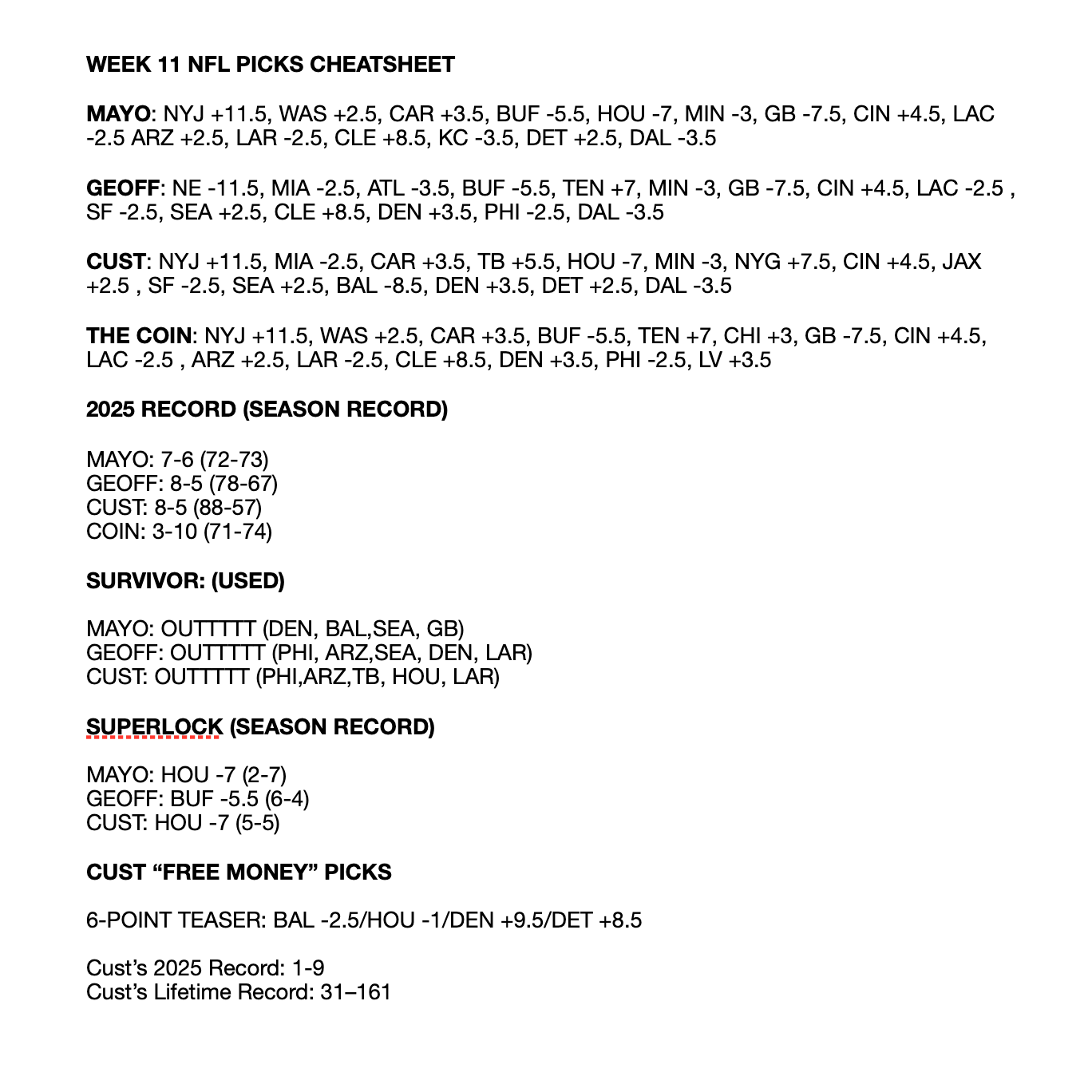 Mayo, Geoff Fienberg, and Tim Anderson go game-by-game and make their 2025 Week 11 Spread Picks, Bets, Survivor Picks, and Props. Plus, a mini Cust Corner on the Hardest Things in Sports and how hard it is to dunk for a regular person.