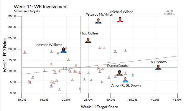 Brown’s target share (40.7%) was nearly higher than his output (49