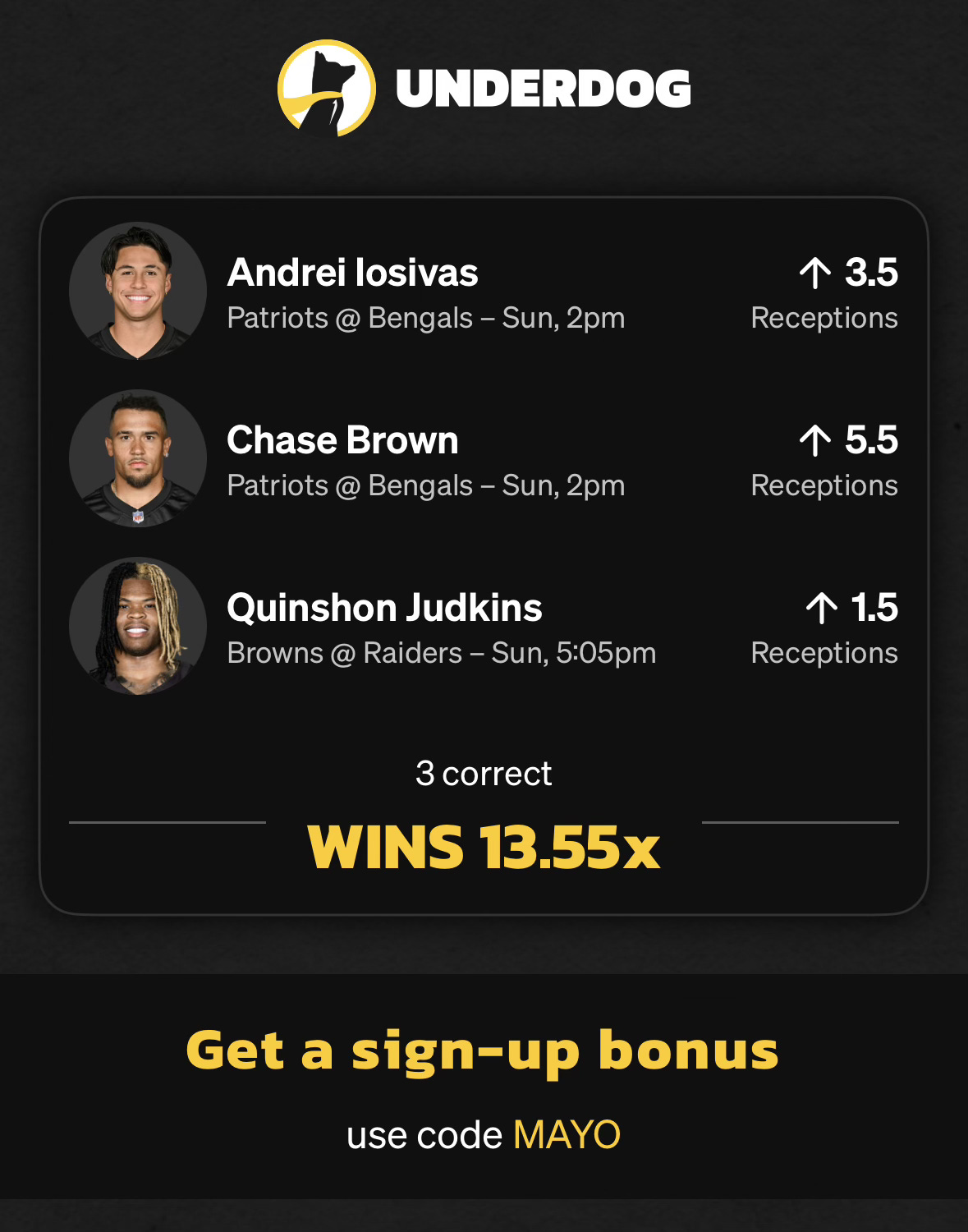 Remember to use the profit boosts in the Underdog lobby to get more value on every entry too! If you’re new to Underdog, code MAYO gets you a deposit bonus, the “Play $5 Get $50 in Bonus Funds to Play $5 Get $100 in Bonus Funds” offer.