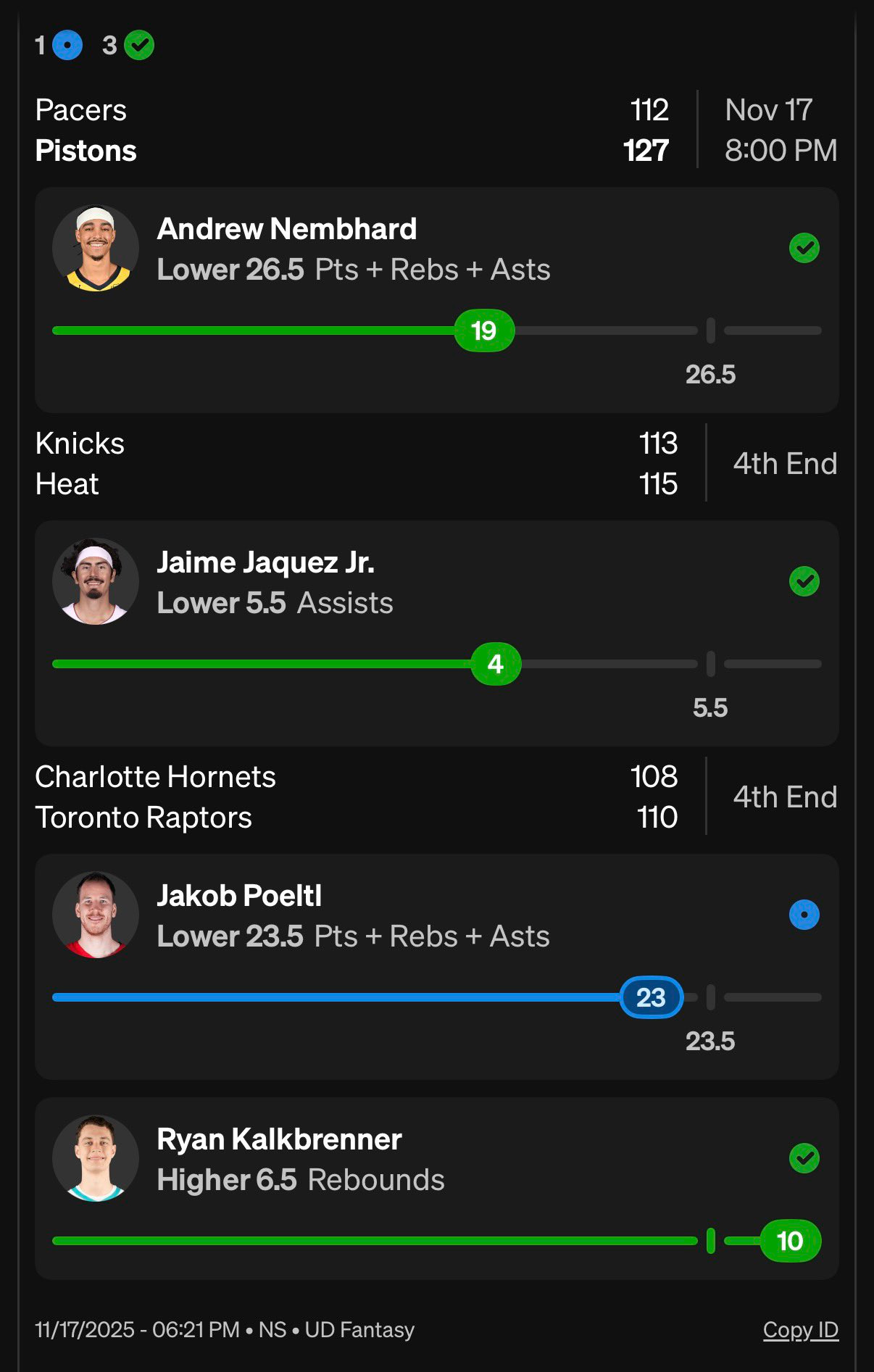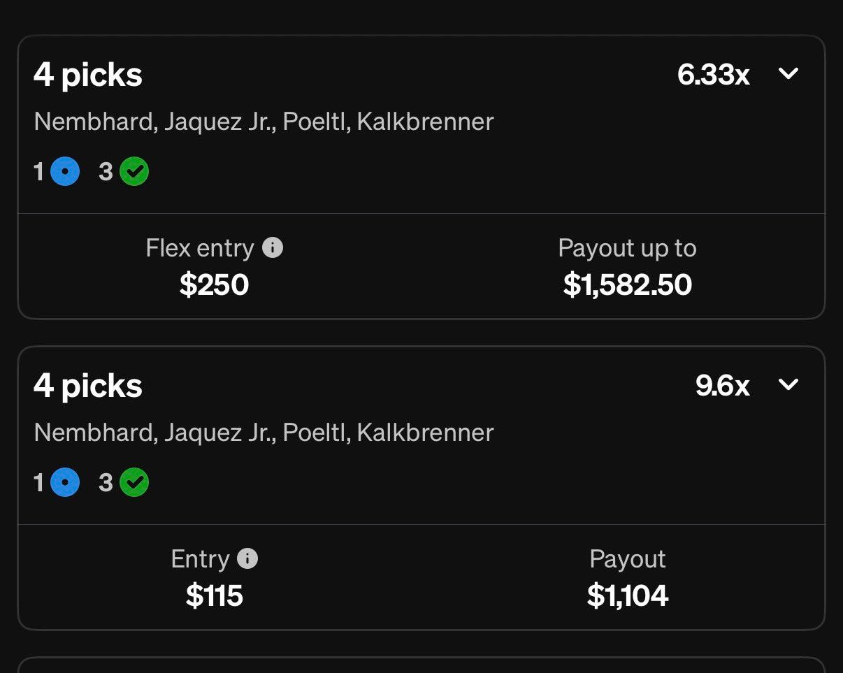 Since I almost exclusively play my props on Underdog, which requires hitting all of them at once rather than the sensible strategy of just individually betting them separately, I pick and choose my spots for when the EV tool on Sharp Stack gives me three or more EV values for more than 6.0. That happened Monday night, so I went hard at it. GREAT SUCCESS!!!! NBA props are really where it’s at (WNBA too when that returns).