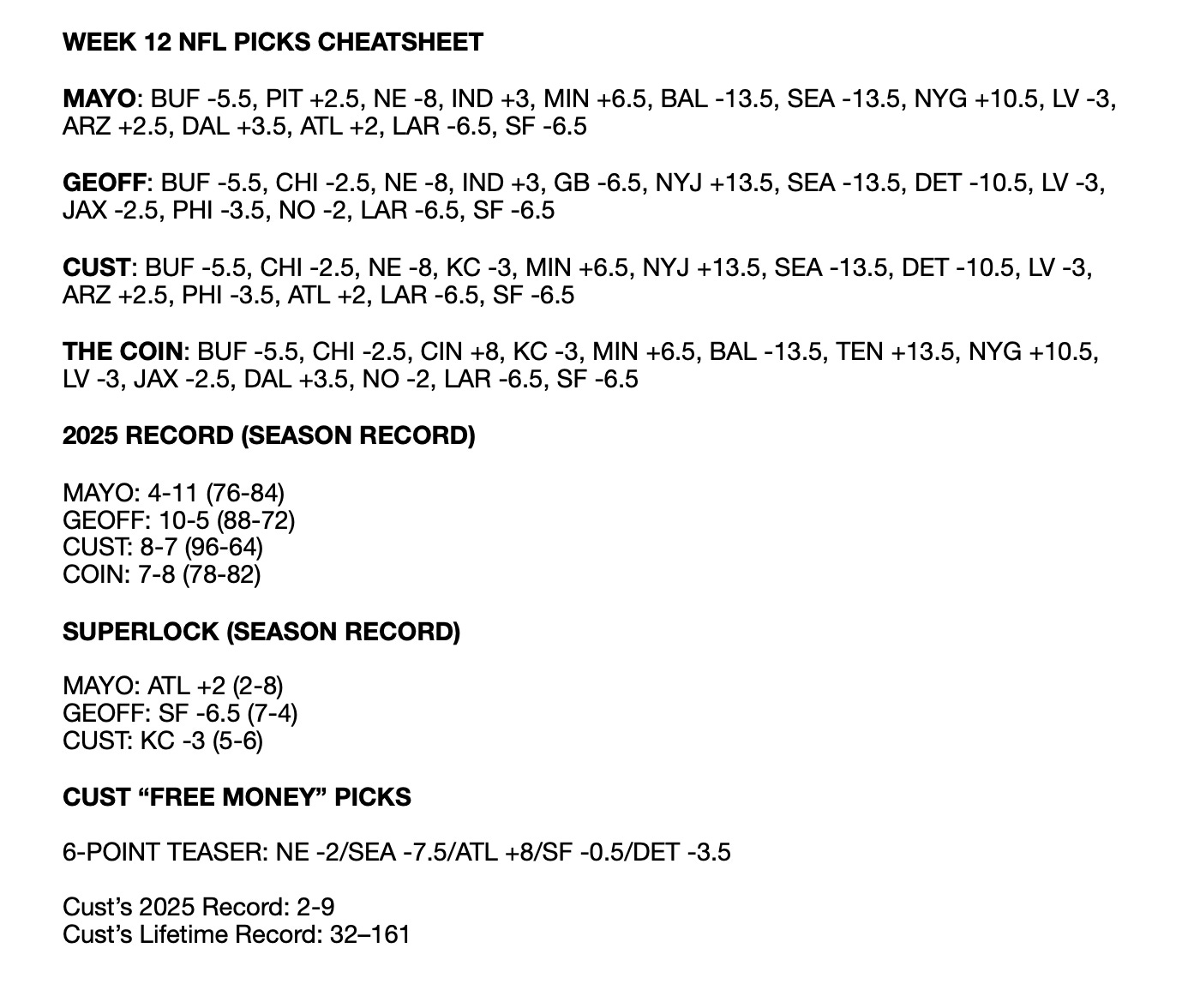 Mayo, Geoff Fienberg, and Tim Anderson go game-by-game and make their 2025 Week 12 Spread Picks, Bets, Survivor Picks, and Props. Plus, a mini Cust Corner on the Easiest Things to do in Sports.