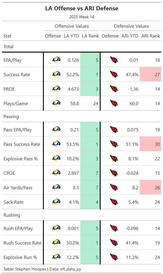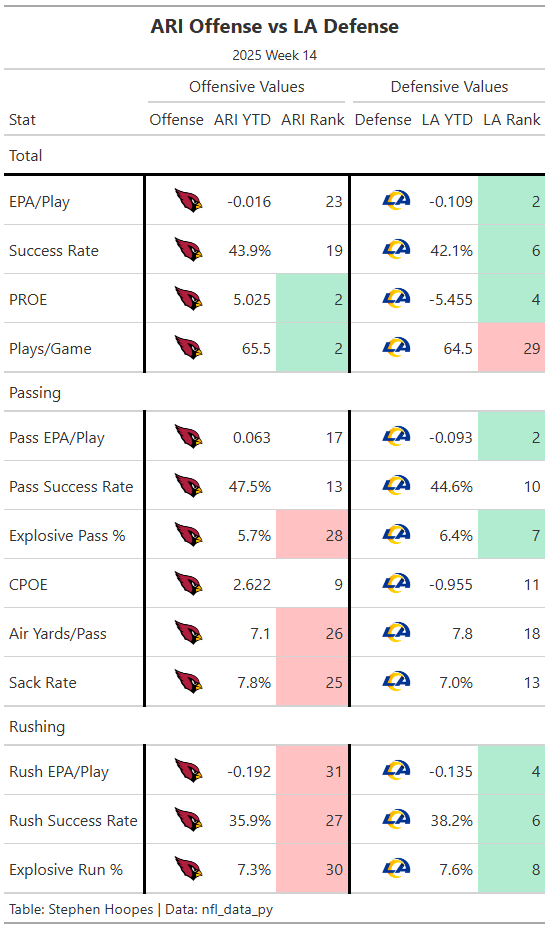 • The Cardinals’ defense is below-average almost across the board, explaining the Rams’ healthy 28 implied points this week.
