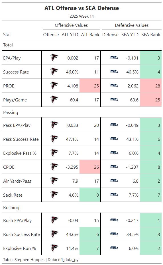 • While the Falcons’ pass defense isn’t quite as good as the Vikings’, they’re still above-average in most statistics and top-tier in limiting completions and generating sacks.