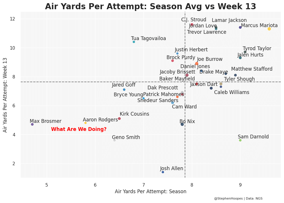The graph below shows every QB that started last week. The x-axis shows their season-long average in air yards per attempt, while the y-axis shows just Week 13. I’m dubbing the bottom-left quadrant the “What Are We Doing?” section. Because seriously, what the hell is this? I get it with Max Brosmer, a rookie QB, going against one of the best defenses in the league. But there’s simply no upside in Pittsburgh or Las Vegas when each attempt is only four yards beyond the line of scrimmage. And don’t even get me started with the Bills. Joe Brady should be arrested for crimes against good football.