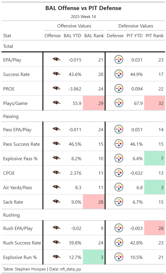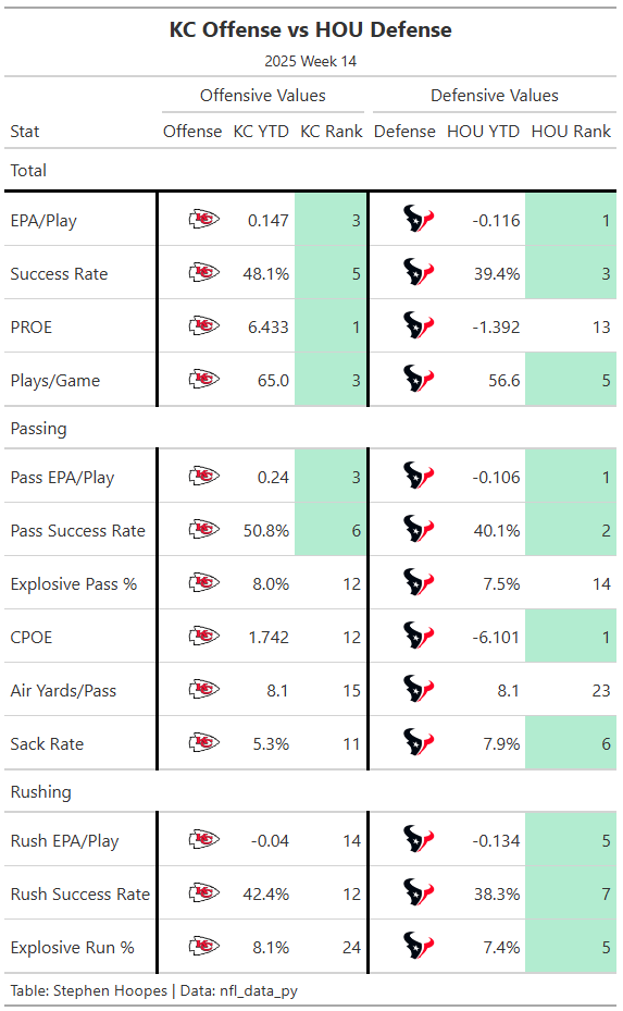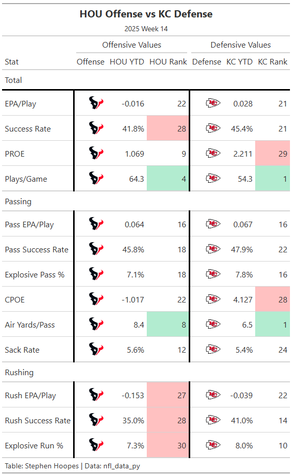 • They’re down to 24th in explosive run rate on the season, while this Texans’ defense is top-five in a ton of statistics, including both rushing efficiency and explosive run rate allowed.