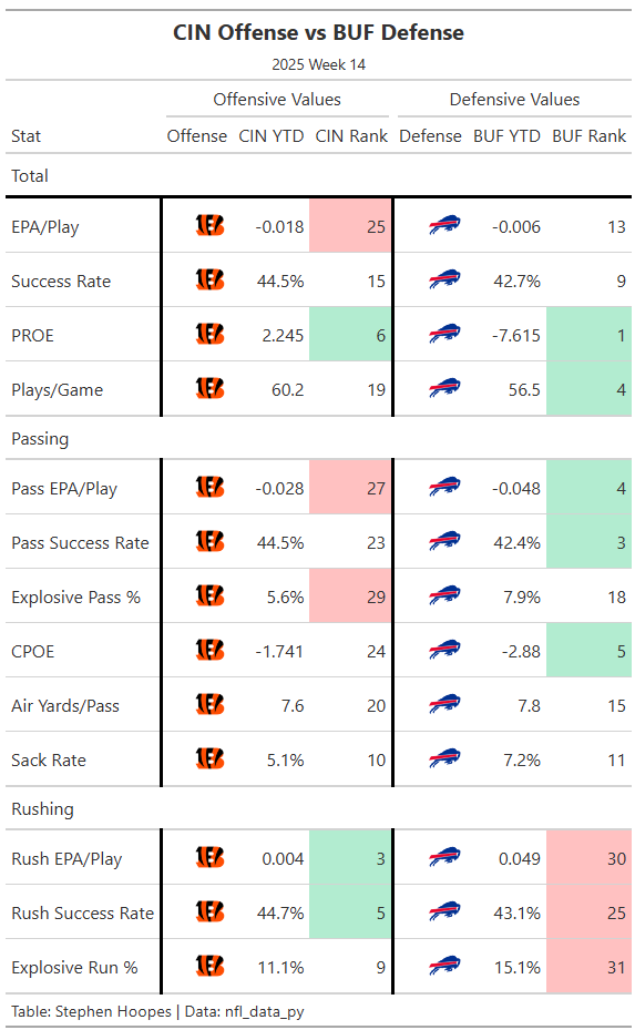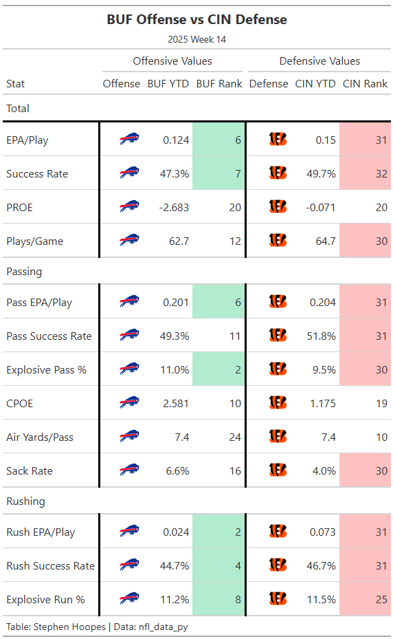 • I think we can throw out most of the passing stats in the Bengals’ table, given Joe Burrow had returned from injury.
