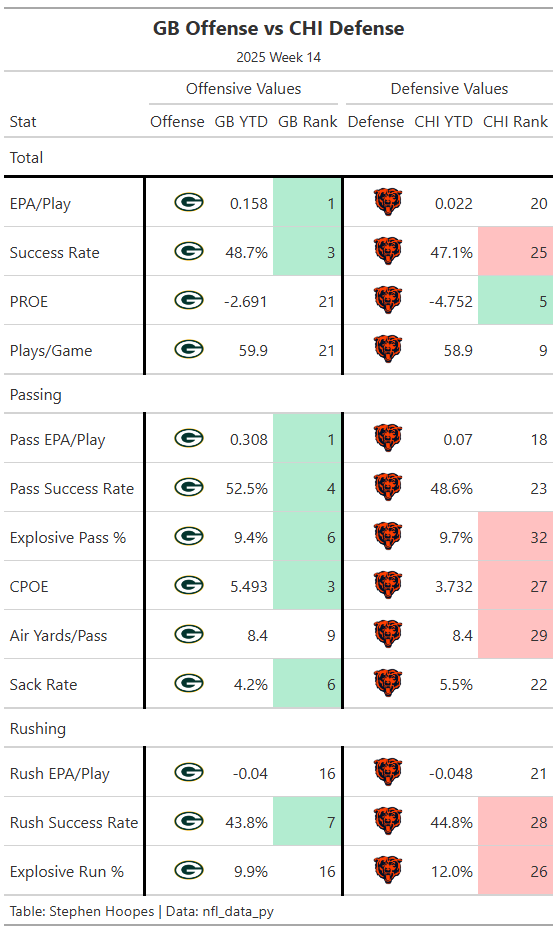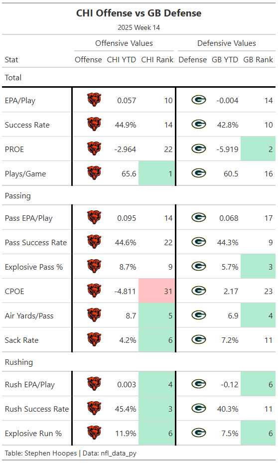 • It should be a fun matchup in the pass game this week as the Bears live off of explosive passes down the field, while the Packers’ defense is the third-best in limiting explosive passes, with opponents opting for the 4th-lowest average target depth against them.