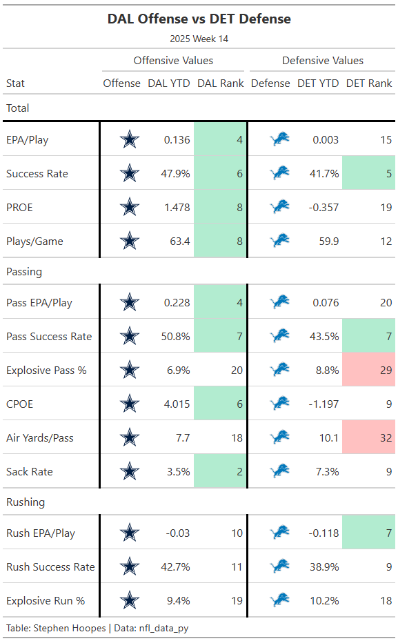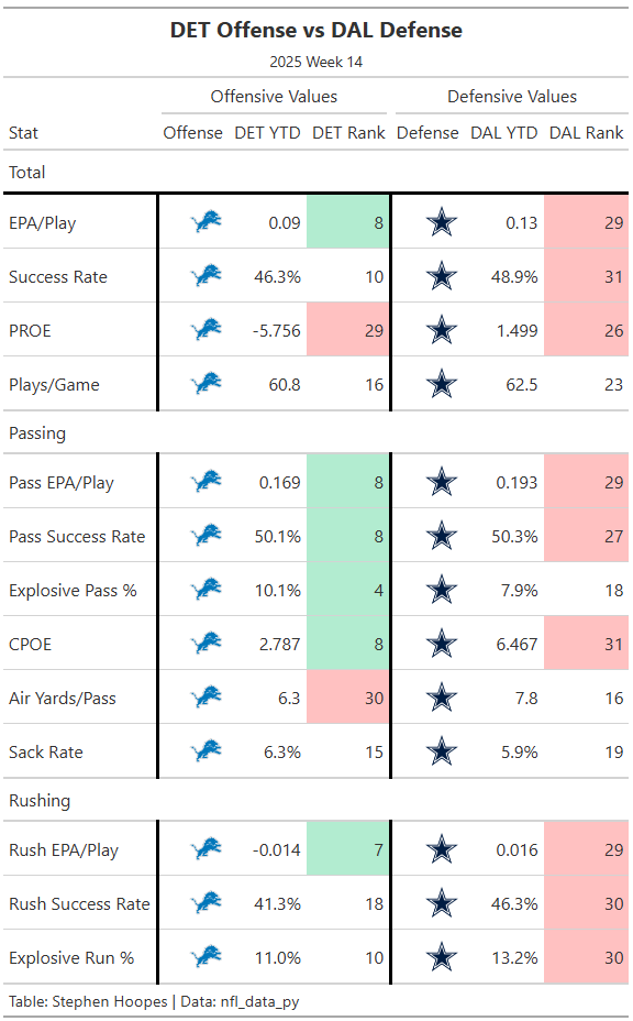 • Week 13 was an uncharacteristically inefficient day for Matthew Stafford, hitting -0.12 EPA per play.