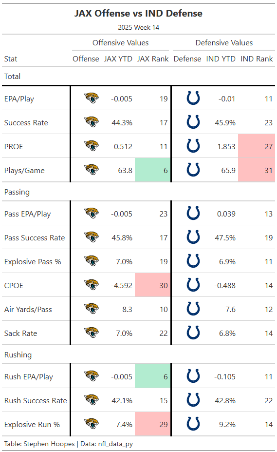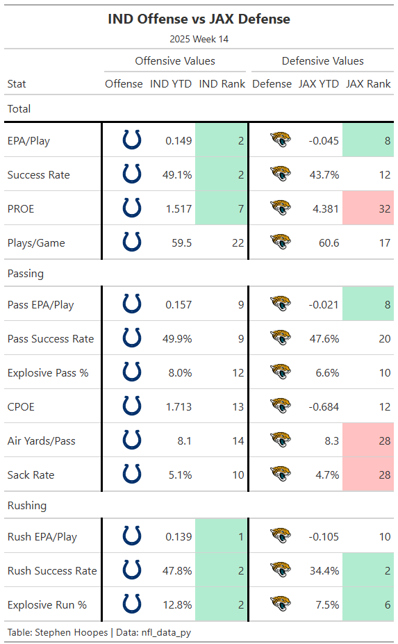 • The Cardinals hit a 9.1% PROE last week and a massive 61.7% success rate; in Jacoby Brissett, we trust.