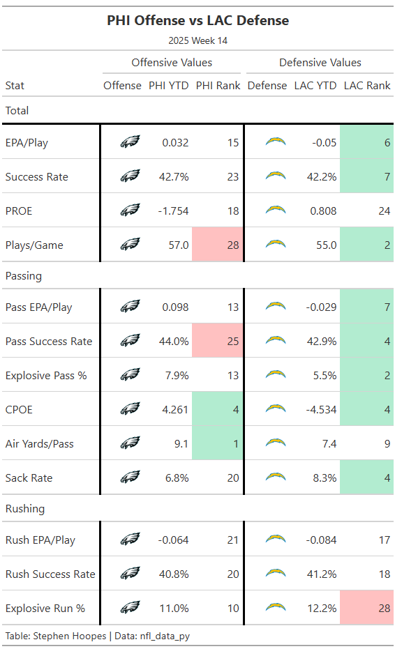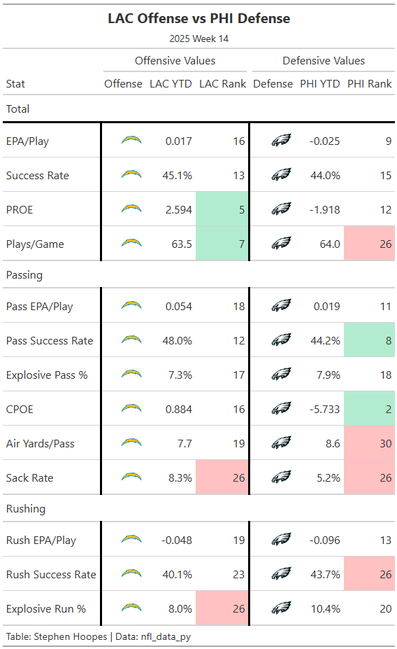 • Success on 3rd down really explains that difference, with EPA giving higher weight to key downs and the Chargers converting 12 of their 17 3rd downs last week.