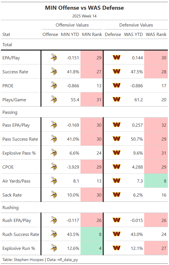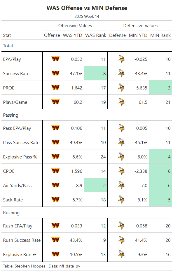 • The Vikings’ pass defense gave Sam Darnold fits last week, limiting him to a very bad -0.23 EPA per play and -15.9% CPOE on an extremely low 3.6-yard aDoT.