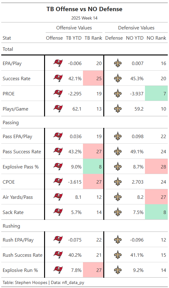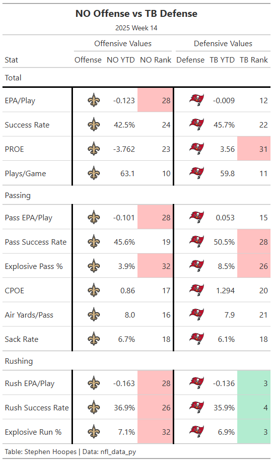 • The Saints leaned into the run with a -5.4% PROE last week, and we’re about average in rushing efficiency.
